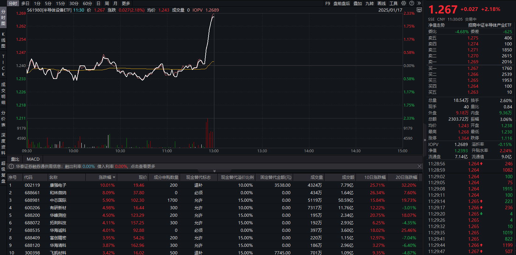 相关ETF方面,截至午间收盘,半导体设备ETF(561980)涨2.18%;成分股方面,康强电子涨停,和林微纳涨超8%,中芯国际涨5.9%,有研新材、华峰测控、拓荆科技等股涨幅居前。