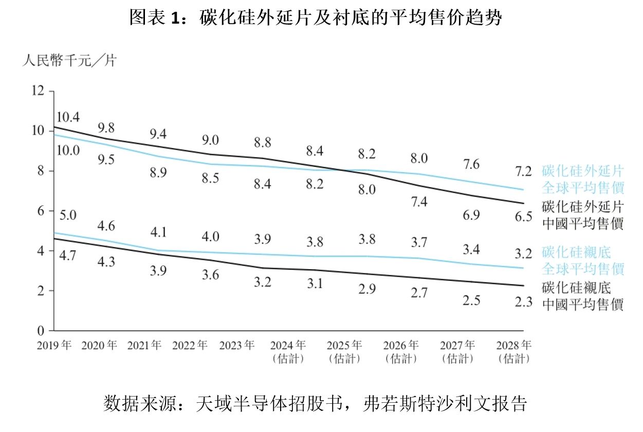 据弗若斯特沙利文的报告,后续碳化硅外延片将继续维持降价趋势。且由于中国碳化硅外延片行业价值链相较于全球市场发展更为成熟,预计2025年后,中国碳化硅外延片平均售价的下降速度将快于全球平均售价的下降速度。