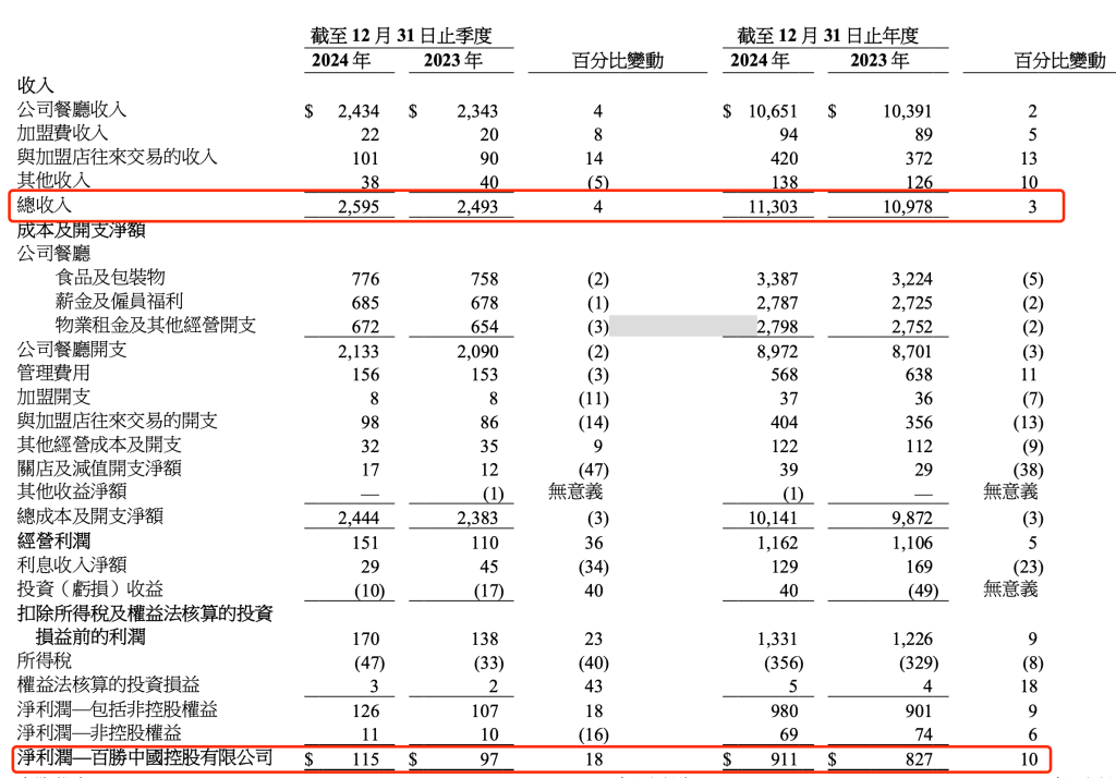 2月6日,百胜中国控股有限公司(“百胜中国”,9987.HK,NYSE:YUMC)公布了2024第四季度及全年财报。2024年第四季度实现总收入25.95亿美元,同比增长4%;实现净利润1.15亿美元,同比增长18%。2024年全年实现总收入113.03亿美元,同比增长3%,创分拆上市以来新高;实现净利润为9.11亿美元,同比增长10%。