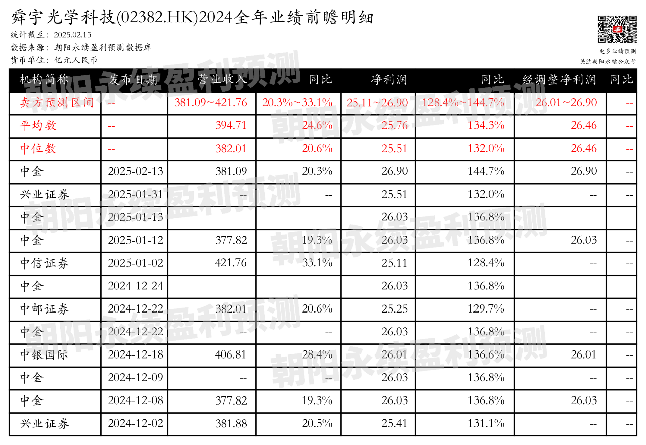 截至2025年02月13日,根据朝阳永续季度业绩前瞻数据:
