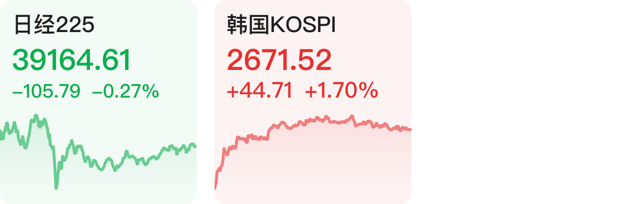 日经225指数跌0.27%,韩国KOSPI指数涨1.7%。