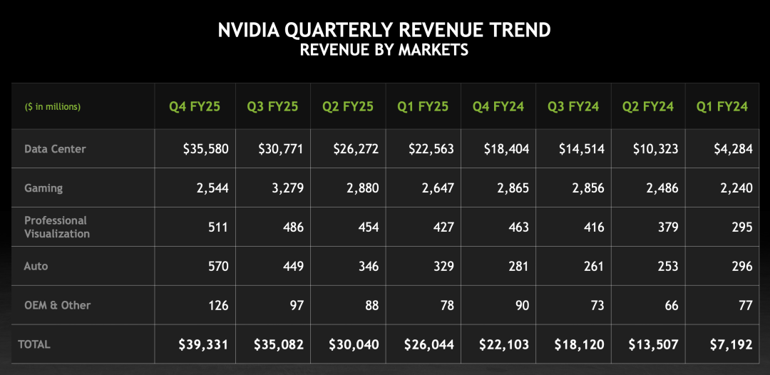 数据中心业务是重点,四季度营收同比增长93.32%至创纪录的355.8亿美元,全年营收增长142%,达到创纪录的1152亿美元。在这一季度,数据中心贡献的营收占比已经超过了90%,如果与2024财年第一季度的42.84亿美元相比,两年时间里,数据中心业务营收已经翻了超过八倍。