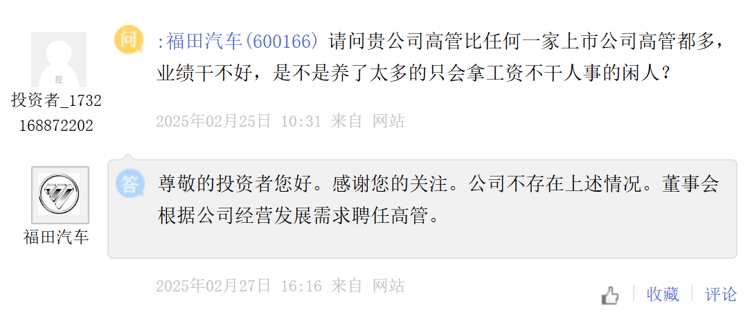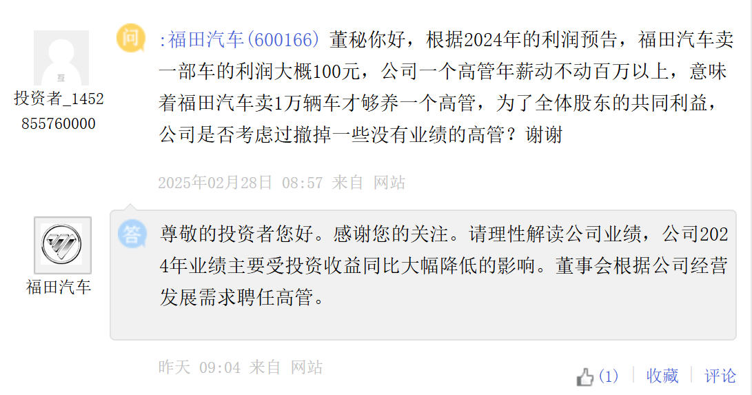 在业绩预减公告披露后,不少投资者在互动平台上对福田汽车的利润提出疑问,更有人质疑公司的高管数量和百万薪酬。