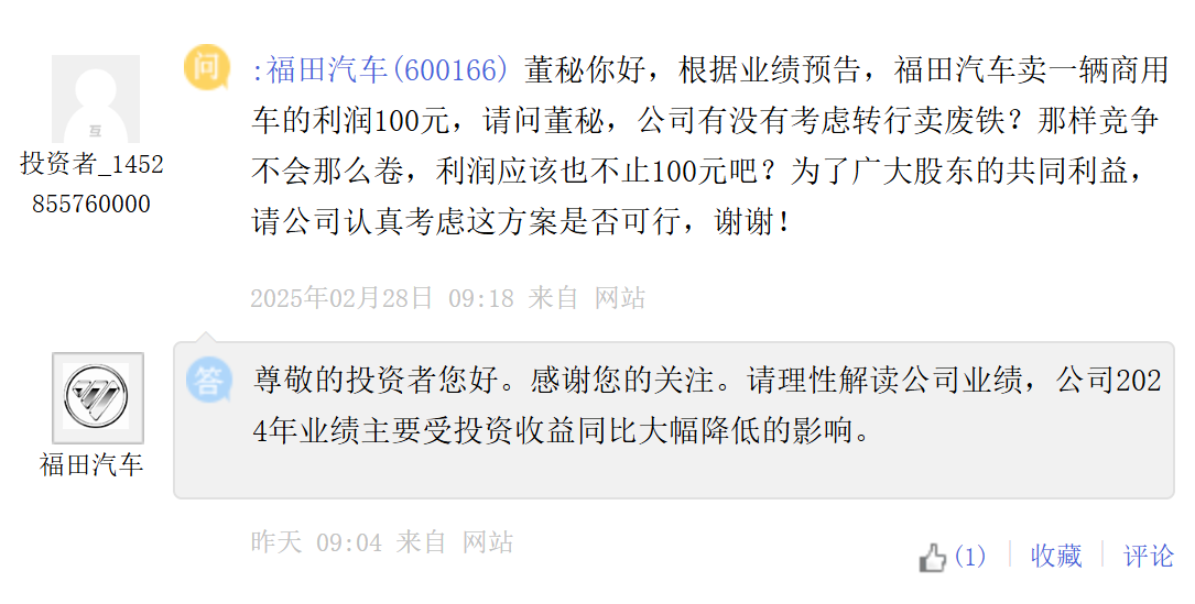 对此,有投资者直言“根据业绩预告,福田汽车卖一辆商用车的利润100元,请问董秘,公司有没有考虑转行卖废铁?那样竞争不会那么卷,利润应该也不止100元吧?为了广大股东的共同利益,请公司认真考虑这方案是否可行。”