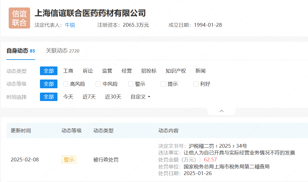 企查查系统显示,日前,上海信谊联合医药药材有限公司(下称“上海信谊”)因“让他人为自己开具与实际经营业务情况不符的发票”,被上海市税务局第二稽查局罚款62.57万元。根据股权穿透图,上海信谊由上海上药信谊药厂有限公司完全控股,为上海医药(601607.SH;02607.HK)旗下公司。