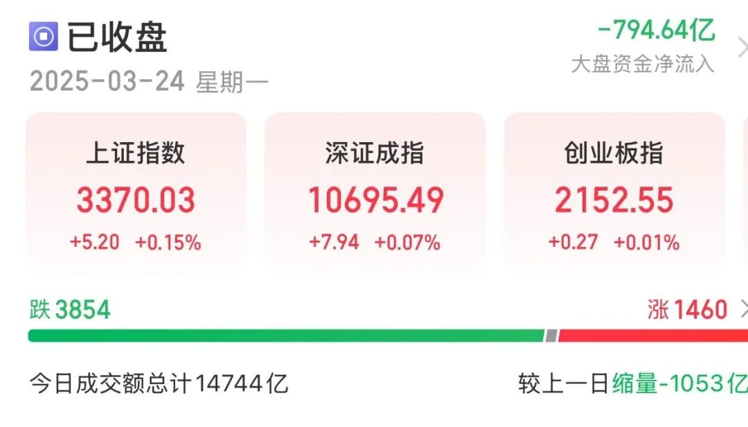 临近尾盘,三大指数回暖,14:49,上证指数率先翻红,随后深证成指、创业板指均小幅上涨。截至收盘,上证指数涨0.15%,深证成指涨0.07%,创业板指涨0.01%,全市场全天成交额1.47万亿元,较上一交易日缩量1053亿元。