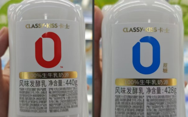 新京报记者近日走访市场发现,“卡士”一款007原味益生菌酸奶,包装中间用红色大字号标注了一个“0”图形商标,给人以产品“零添加”的错觉。仔细查看可以发现,该“0”图形右下角有“TM”标志。经中国商标网查询,该图形为卡士乳业(深圳)有限公司申请注册的第29类商标,适用于酸奶、奶酪等奶制品,目前处于“等待实质审查”状态。“卡士”旗下另一款007无蔗糖益生菌酸奶,同样使用了该图形,但右下角却没有“TM”标志,取而代之的是“蔗糖”字样,表达“0蔗糖”含义。