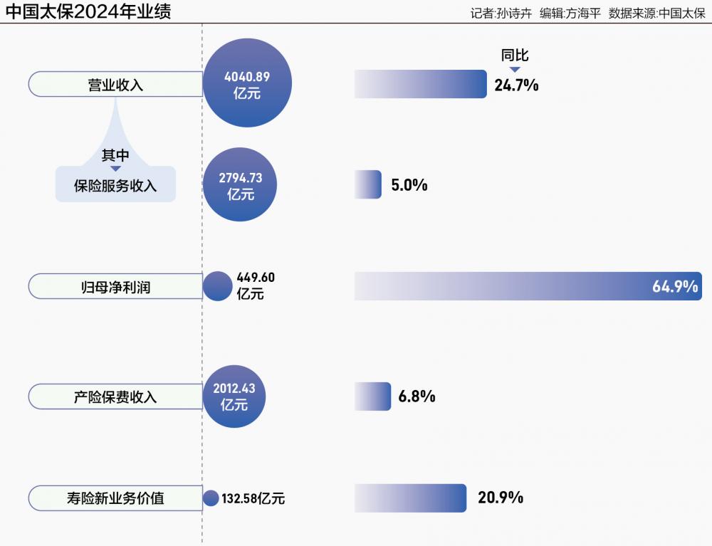2024年,中国太保集团营业收入达4040.89亿元,同比增长24.7%,其中保险服务收入2794.73亿元,同比增长5.0%;归母净利润449.60亿元,同比增长64.9%。全年实现新业务价值132.58亿元,同比增长20.9%,新业务价值率达16.8%,同比上升3.5个百分点。经济假设调整前,新业务价值同比增长57.7%,新业务价值率同比上升8.6个百分点。