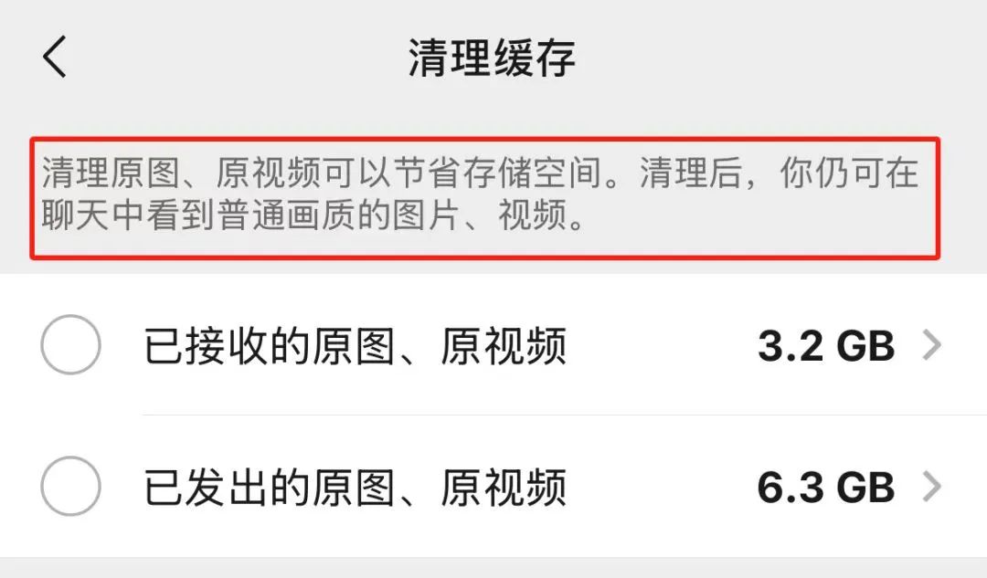在“我-设置-通用-存储空间”界面中缓存区域下方新增一行小字,包括聊天记录中的xx MB的原图、原视频,点击“去清理”后,能看到两个选项:已发出的原图、原视频和已接收的原图、原视频,在选项上方有一排小字清理原图、原视频可以节省存储空间。被清理的内容仍会在聊天记录中显示,但画质已降低,该功能既能避免“图片已过期”,还能腾出存储空间实现微信瘦身。
