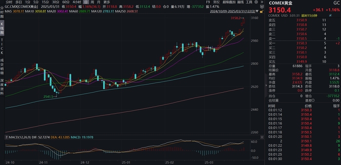 3月31日,伦敦现货黄金价格跳开上涨,上午盘最高触及3097.6美元/盎司,继3月28日日内触及历史高位3077美元/盎司后进一步上破,较年初涨幅超16%。同时纽约期金价格延续走升,日内最高价触及3129.1美元/盎司。