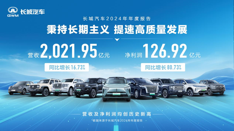 3月28日,长城汽车发布2024年报显示,2024年长城汽车全年总营业收入2021.95亿元,同比增长16.73%;净利润126.92亿元,同比增长80.73%,创历史新高;扣非归母净利润97.35亿元,同比增长101.4%。