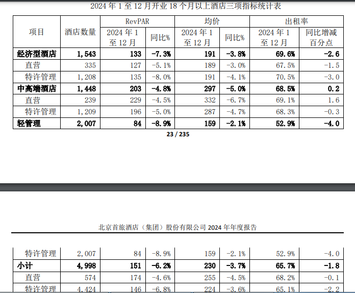 《财中社》发现,首旅酒店的中高端酒店均价下降最大,2024年同比下滑5%,其中直营酒店下滑6.7%。不过出租率有所回升。换句话说,中高端酒店正在以价换量。