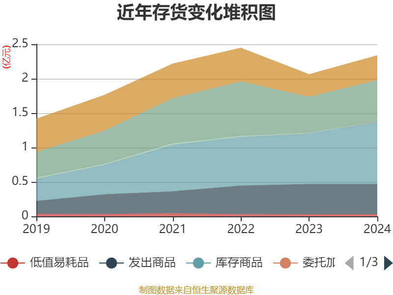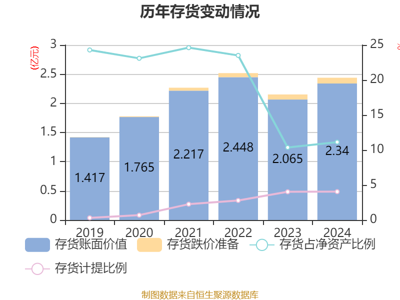 从存货变动来看,截至2024年末,公司存货账面价值为2.34亿元,占净资产的11.13%,较上年末增加2746.65万元。其中,存货跌价准备为988.71万元,计提比例为4.05%。