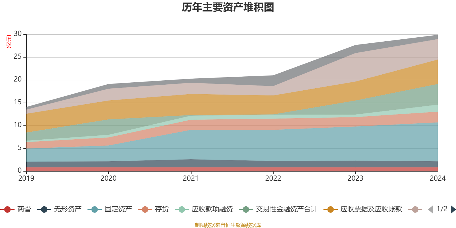 资产重大变化方面,截至2024年末,公司货币资金较上年末减少28.23%,占公司总资产比重下降7.6个百分点;交易性金融资产合计较上年末增加46.83%,占公司总资产比重上升4.01个百分点;应收款项融资较上年末增加178.1%,占公司总资产比重上升3.16个百分点;应收票据及应收账款较上年末增加29.32%,占公司总资产比重上升2.96个百分点。
