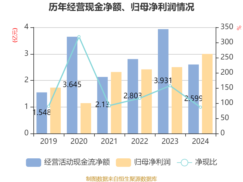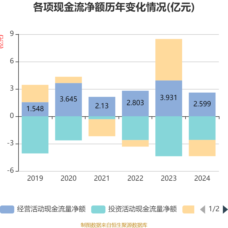 截至2024年,公司经营活动现金流净额为2.6亿元,同比下降33.89%;筹资活动现金流净额-1.78亿元,同比减少6.33亿元;投资活动现金流净额-2.59亿元,上年同期为-4.38亿元。