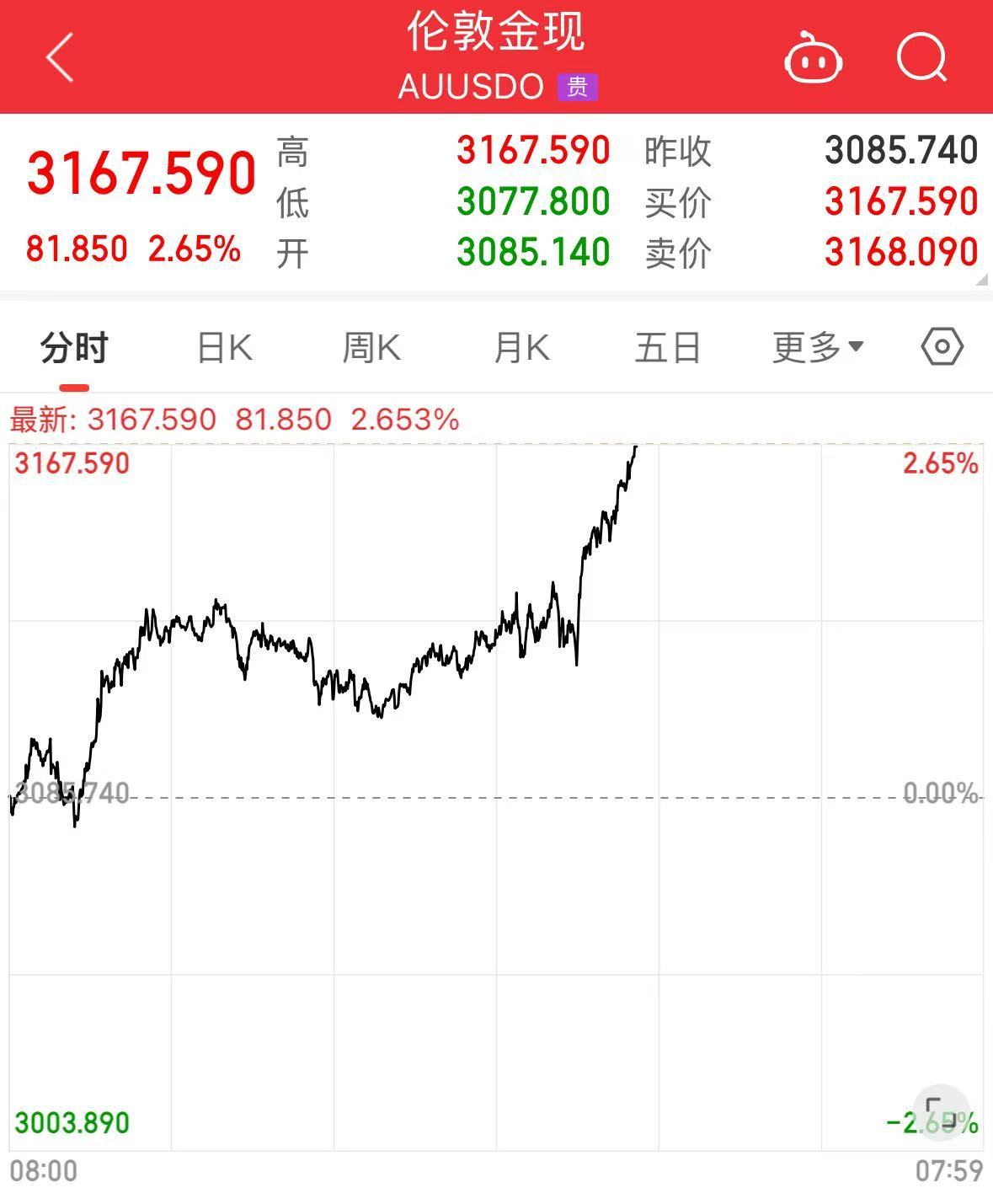 现货黄金价格上涨2.65%,再创历史新高,最高触及3167.67美元/盎司。白银涨0.45%。
