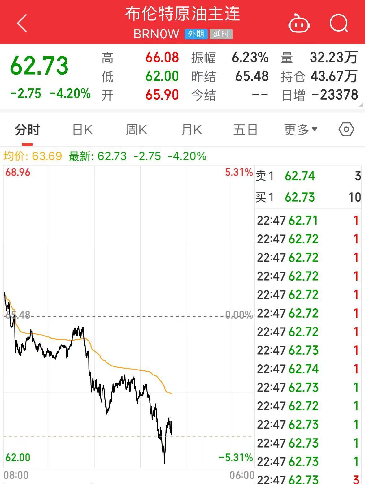 国际原油价格下跌,布油、美油跌超4%。