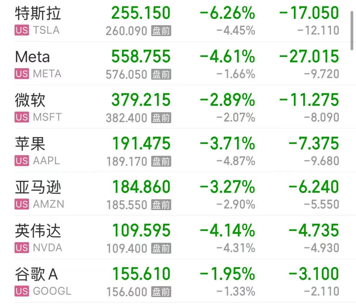 大型科技股集体下跌,特斯拉跌超6%,Meta、英伟达跌超4%,苹果、亚马逊跌超3%,微软跌超2%,谷歌跌超1%。
