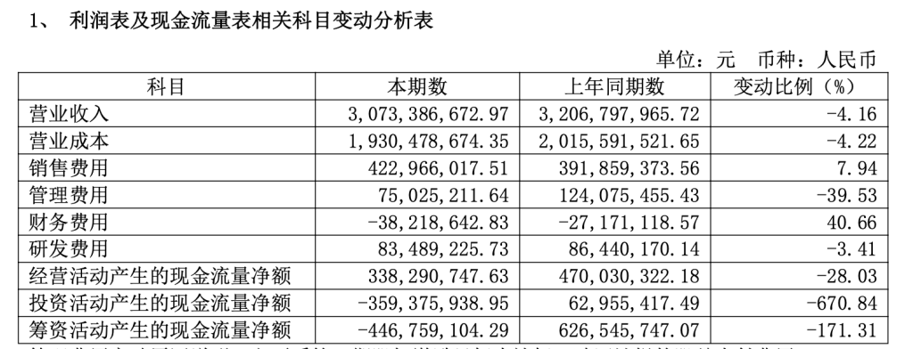 此外,财报显示,经营活动产生的现金流量净额同比下滑近三成,主要系大额可转让存单作为票据保证受限;投资活动产生的现金流量净额同比下滑超6.7倍,主要系报告期内用于购买理财的资金减少。筹资活动产生的现金流量净额同比下滑超1.7倍,主要系上年同期收到向特定对象发行股票款及本期现金分红金额大幅增加所致。