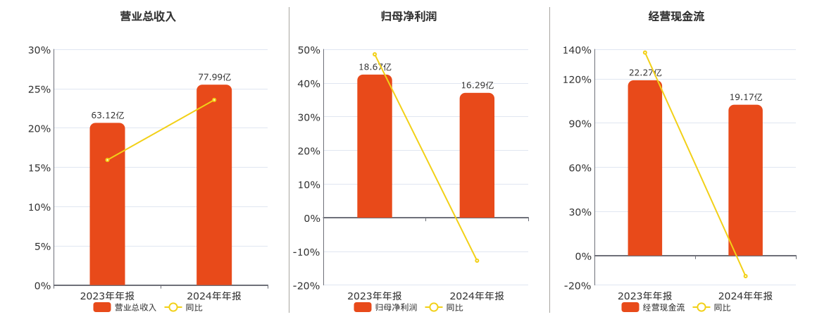公司营业总收入为77.99亿元。归母净利润为16.29亿元,较去年同报告期归母净利润减少2.38亿元,同比较去年同期下降12.76%。经营活动现金净流入为19.17亿元,较去年同报告期经营活动现金净流入减少3.11亿元,同比较去年同期下降13.96%。