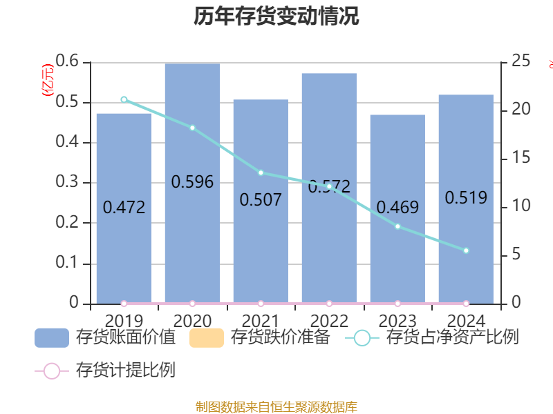 从存货变动来看,截至2024年末,公司存货账面价值为5188.14万元,占净资产的5.49%,较上年末增加496.76万元。公司本期没有计提存货跌价准备。