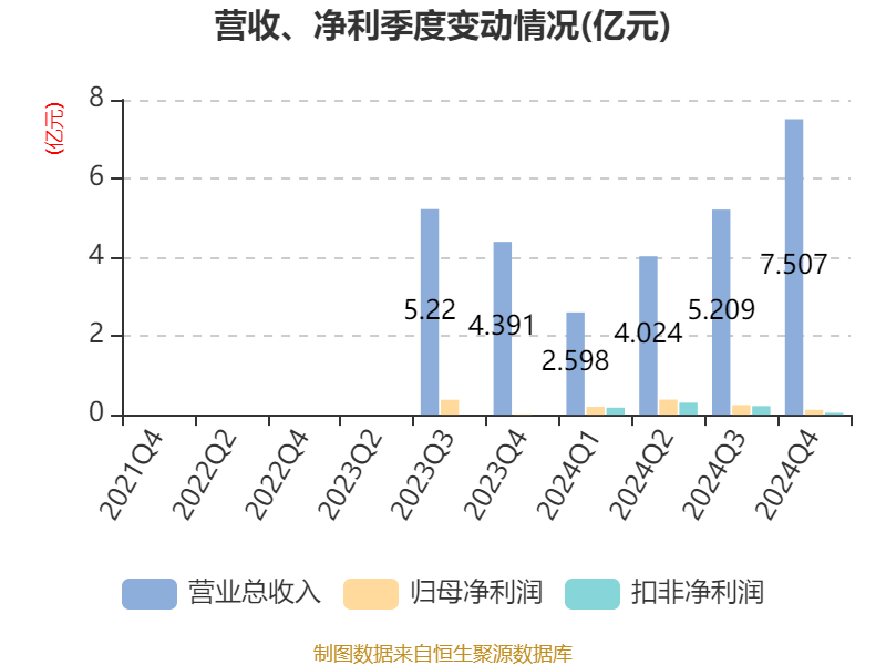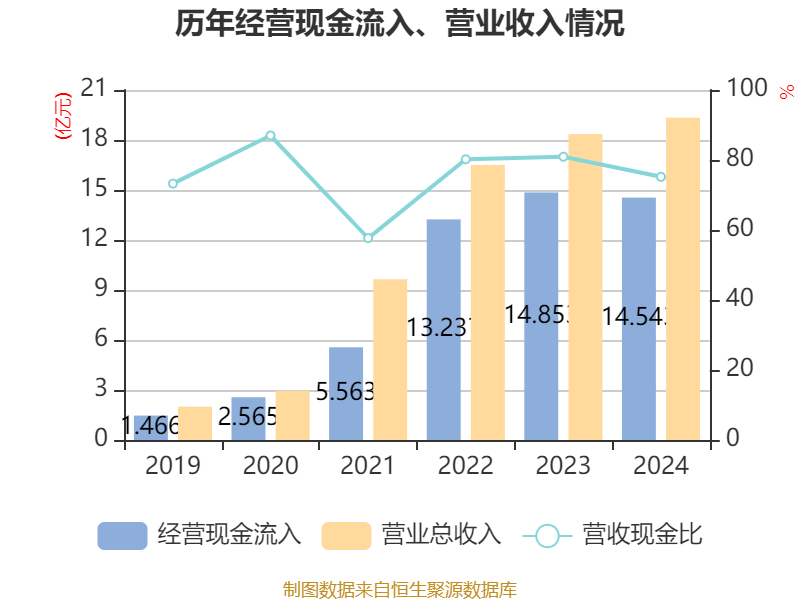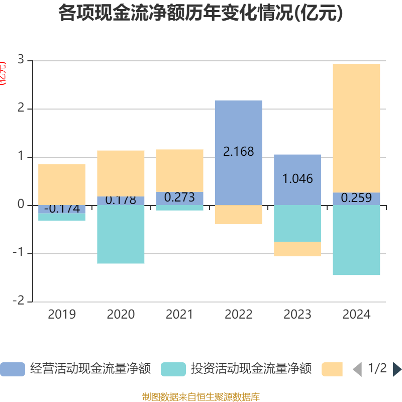 截至2024年,公司经营活动现金流净额为2593.86万元,同比下降75.21%;筹资活动现金流净额2.67亿元,同比增加2.97亿元;投资活动现金流净额-1.45亿元,上年同期为-7625.14万元。