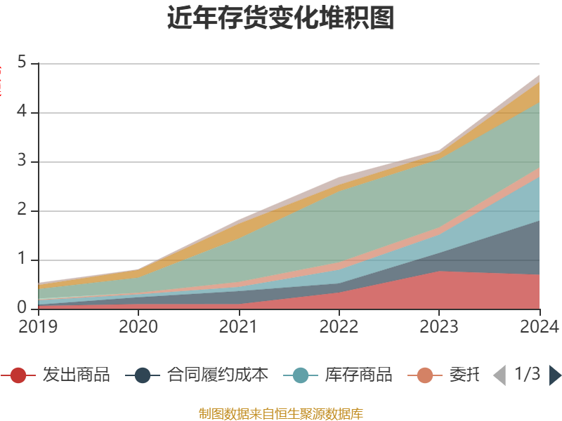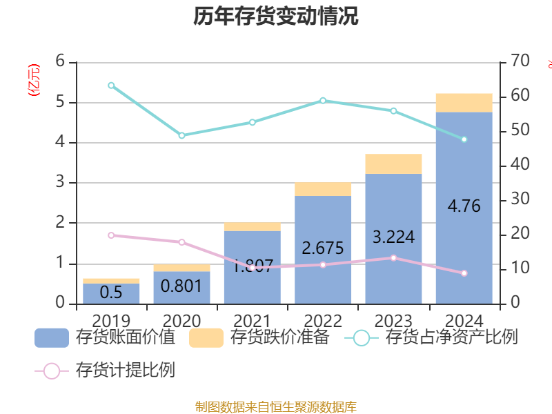 从存货变动来看,截至2024年末,公司存货账面价值为4.76亿元,占净资产的47.6%,较上年末增加1.54亿元。其中,存货跌价准备为4597.2万元,计提比例为8.81%。