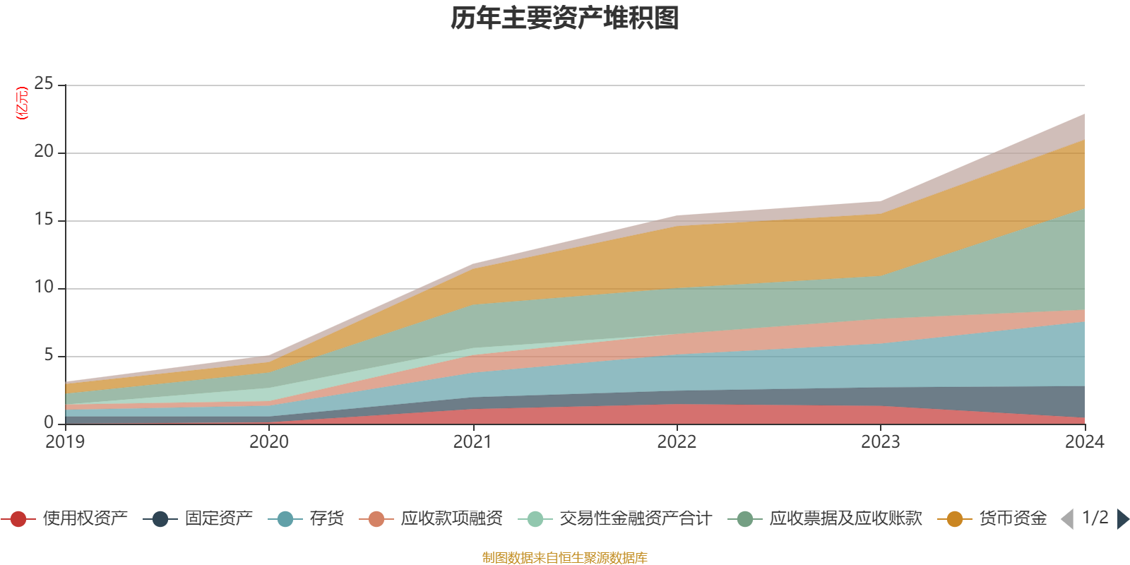 资产重大变化方面,截至2024年末,公司应收票据及应收账款较上年末增加136.22%,占公司总资产比重上升13.41个百分点;应收款项融资较上年末减少52.01%,占公司总资产比重下降7.32个百分点;使用权资产较上年末减少66.31%,占公司总资产比重下降6.09个百分点;货币资金较上年末增加10.83%,占公司总资产比重下降5.71个百分点。