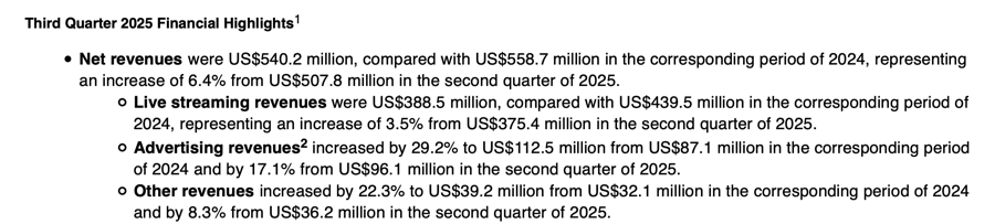 拆分来看,欢聚集团的业务构成中,第三季度的直播收入为3.89亿美元,同比下滑11.6%、环比增长3.5%;广告收入同比增长29.2%、环比增长17.1%至1.13亿美元;其他收入同比增长22.3%、环比增长8.3%至3920万美元。
