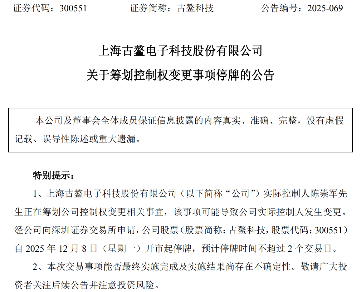 风波不断、深陷亏损泥潭的古鳌科技(300551)12月7日晚间公告,公司实际控制人陈崇军正在筹划公司控制权变更相关事宜,该事项可能导致公司实际控制人发生变更。公司股票自12月8日(星期一)开市起停牌,预计停牌时间不超过2个交易日。目前,各方主体正在就具体交易方案、协议等相关事项进行论证和磋商。