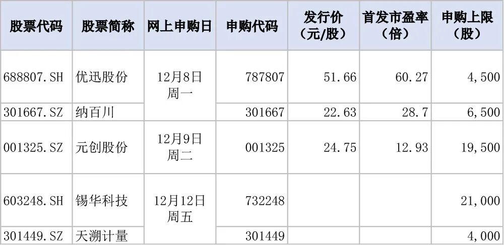 据目前安排,若无变化,下周(12月8日至12日)有5只新股可申购,包括科创板1只、创业板2只和沪深主板各1只。