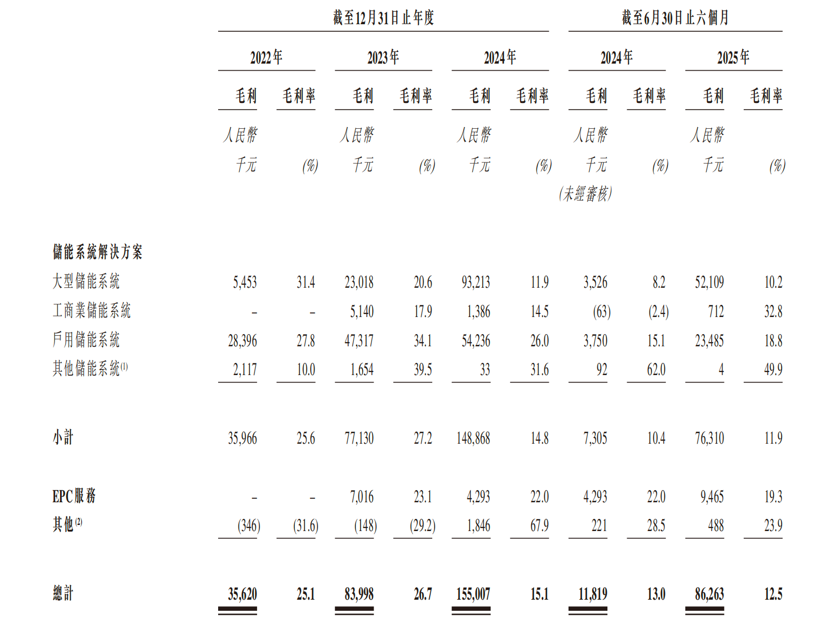 招股书显示,公司大型储能系统的营收占比迅速攀升,从2022年的12.2%增长至2023年的35.6%,2024年进一步跃升至76.6%,今年上半年微降至74.2%。与之相对,户用储能系统的营收占比则从2022年的72.1%,快速降至2024年的20.3%。
