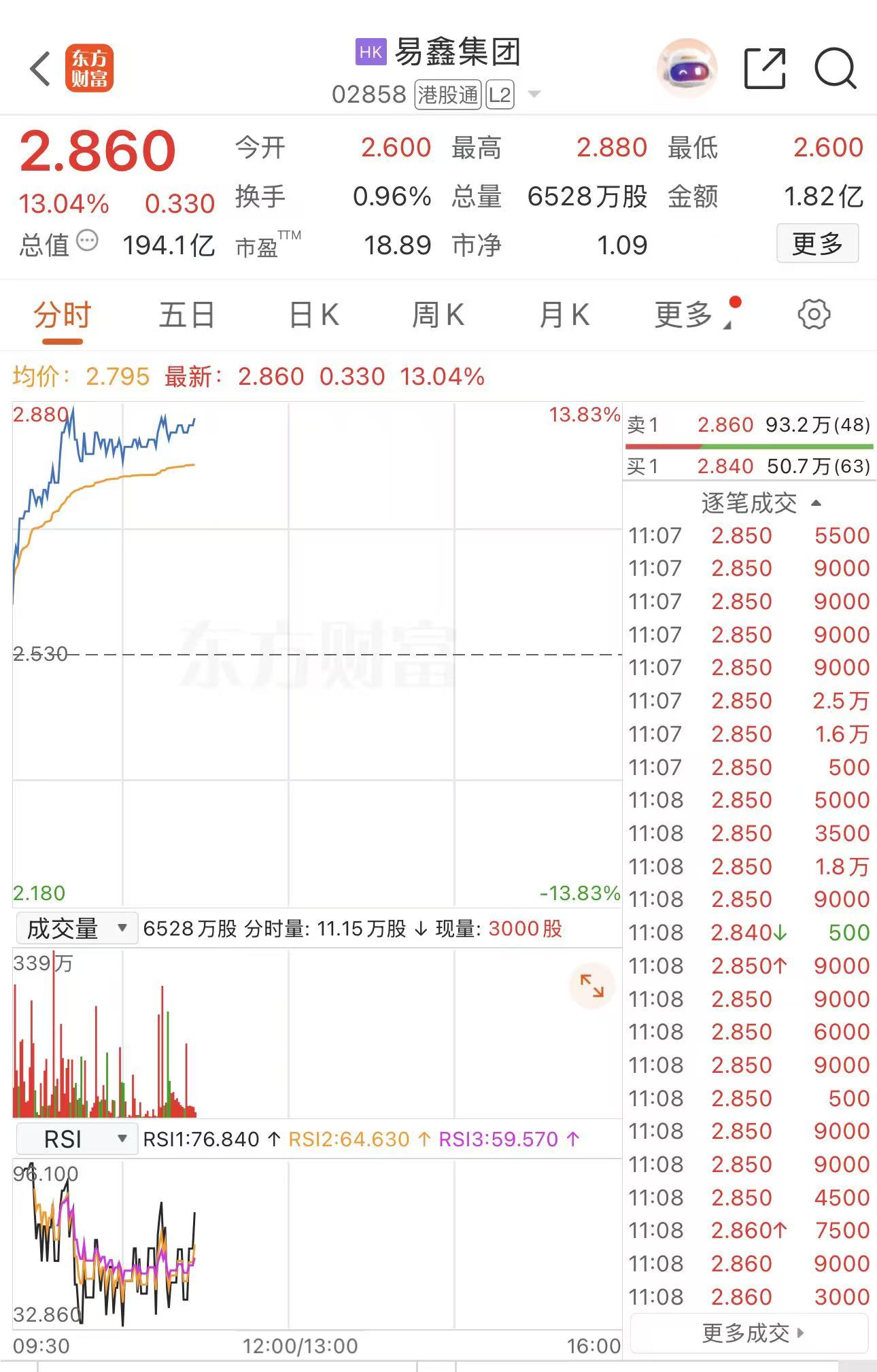 上证报中国证券网讯(记者唐燕飞)今日早盘,易鑫集团股价高开后一路上涨,盘中一度涨近14%。截至11时08分,易鑫集团涨13.04%,报2.86港元/股,成交额约为1.82亿港元,总市值为194.1亿港元。