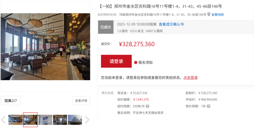 12月9日,据京东资产拍卖平台信息,位于郑州市金水区农科路16号11号楼1-4,31-43,45-46层146号的不动产以3.28亿元的底价拍出。
