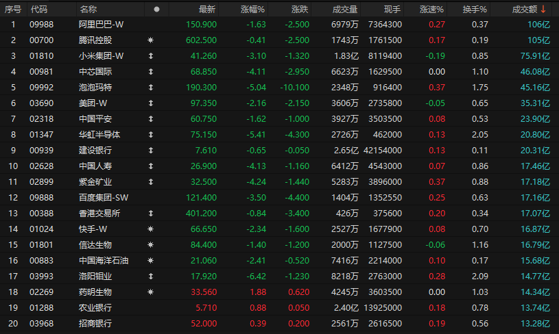 港股成交额前二十