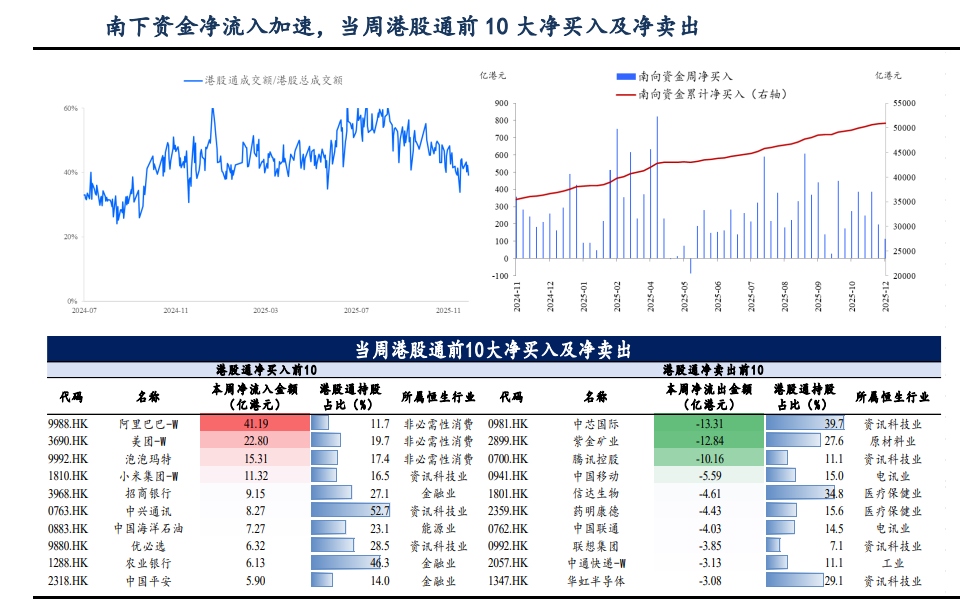 港股:本周恒生科技上升 1.1%,恒指上升 0.9%,恒生港股通上升 0.8%。 行业上,原材料业领涨。南向资金主要流入非必需性消费,主要流出工业。