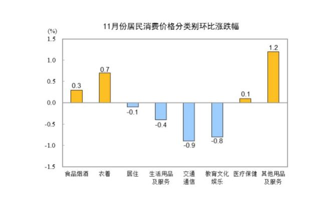 11月份,全国居民消费价格环比下降0.1%。其中,城市下降0.1%,农村持平;食品价格上涨0.5%,非食品价格下降0.2%;消费品价格上涨0.1%,服务价格下降0.4%。