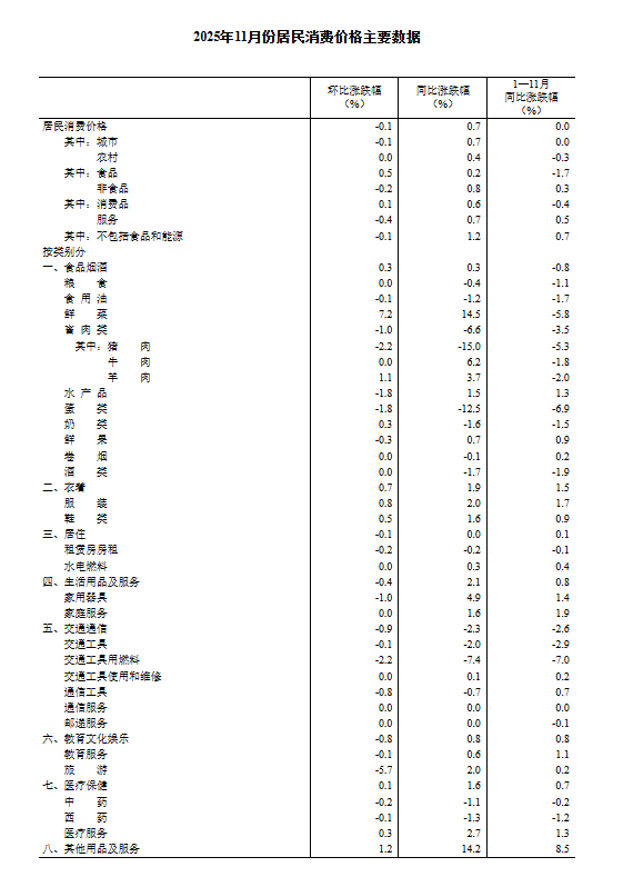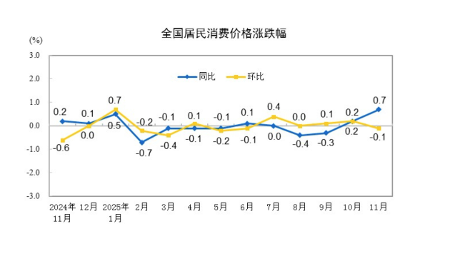 中新网12月10日电据国家统计局网站消息,2025年11月份,全国居民消费价格同比上涨0.7%。其中,城市上涨0.7%,农村上涨0.4%;食品价格上涨0.2%,非食品价格上涨0.8%;消费品价格上涨0.6%,服务价格上涨0.7%。1—11月平均,全国居民消费价格与上年同期持平。