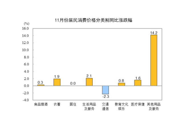 11月份,食品烟酒类价格同比上涨0.3%,影响CPI(居民消费价格指数)上涨约0.09个百分点。食品中,鲜菜价格上涨14.5%,影响CPI上涨约0.31个百分点;水产品价格上涨1.5%,影响CPI上涨约0.03个百分点;鲜果价格上涨0.7%,影响CPI上涨约0.01个百分点;蛋类价格下降12.5%,影响CPI下降约0.08个百分点;畜肉类价格下降6.6%,影响CPI下降约0.20个百分点,其中猪肉价格下降15.0%,影响CPI下降约0.21个百分点;粮食价格下降0.4%,影响CPI下降约0.01个百分点。