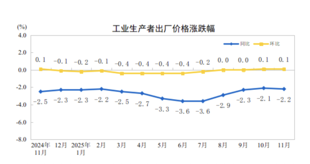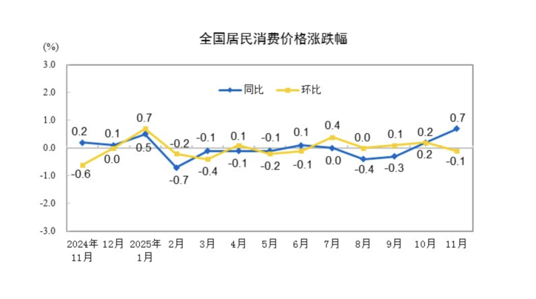 12月10日,国家统计局公布2025年11月份CPI和PPI数据。数据显示,今年11月份,全国居民消费价格(CPI)同比上涨0.7%,环比下降0.1%;全国工业生产者出厂价格(PPI)同比下降2.2%,工业生产者购进价格同比下降2.5%;工业生产者出厂价格和购进价格环比均上涨0.1%,涨幅均与上月相同。