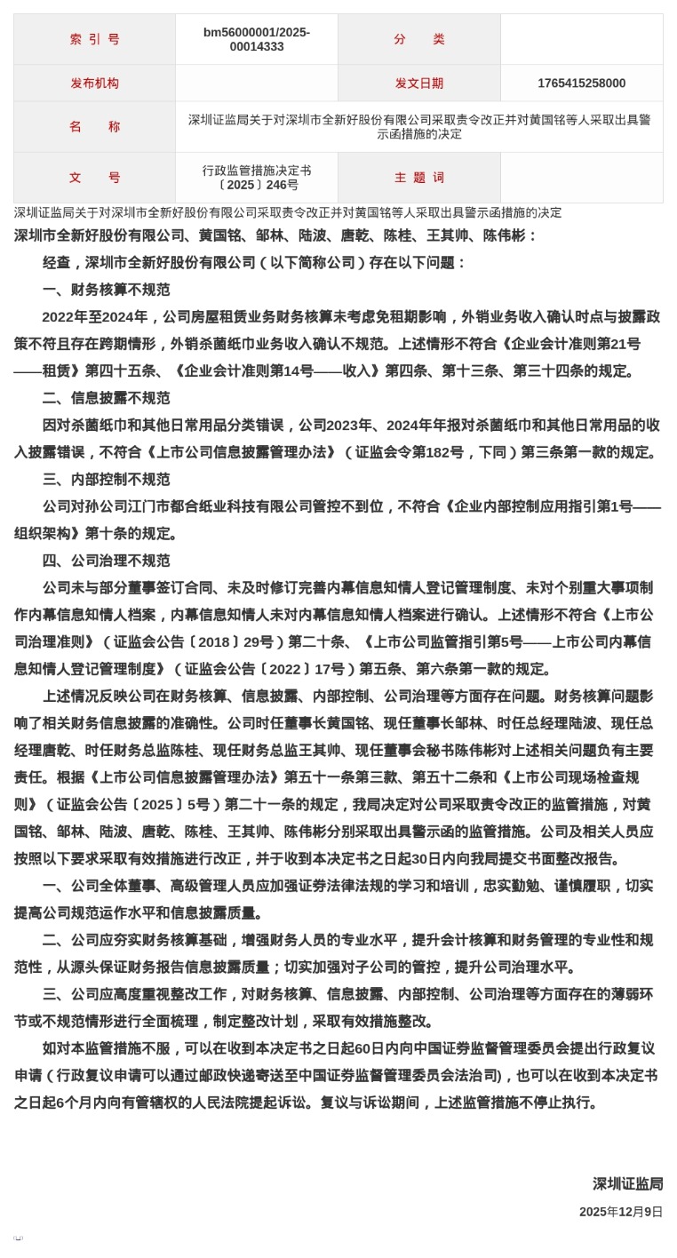 深圳市全新好股份被责令改正,责任人被出具警示函