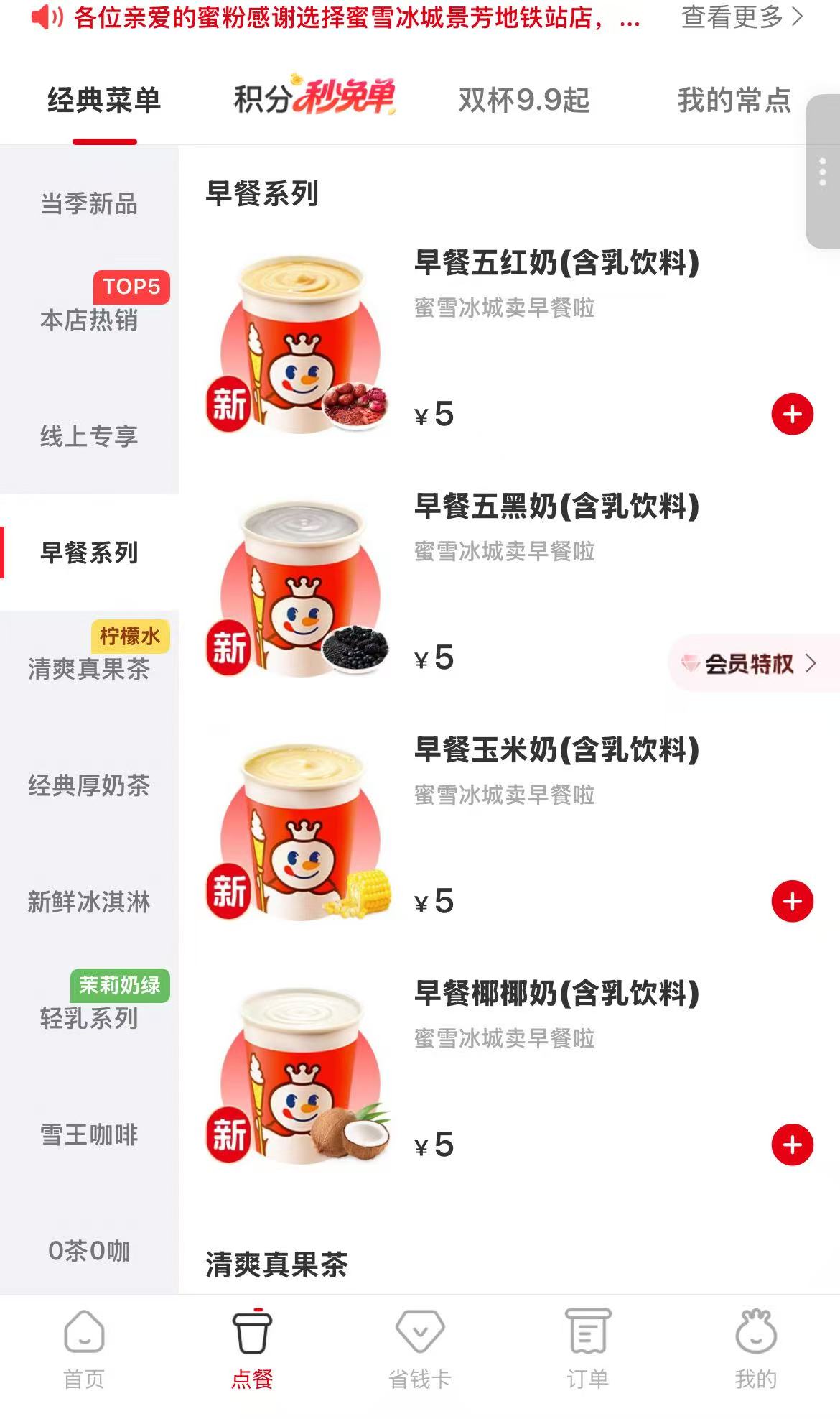 延续此前的价格策略,蜜雪冰城的早餐品类依旧走的是平价路线。蓝鲸新闻查询已设有“早餐系列”的蜜雪冰城门店菜单发现,目前在售四款早餐奶单价均为5元。此外还有三款面包单价2.9元。早餐奶+面包的套餐价为7.9元。
