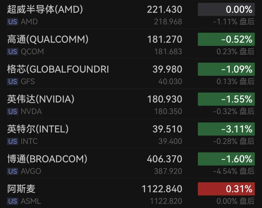 甲骨文的业绩也拖累了其他相关股票,芯片股多数下跌。费城半导体指数跌0.75%,ARM跌超3%,迈威尔科技跌逾3%,英特尔跌超3%,美光科技跌逾1%,应用材料跌超1%,微芯科技涨逾1%。