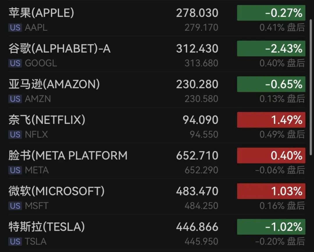大型科技股多数下跌,谷歌跌超2%,英伟达跌逾1%,特斯拉跌超1%,亚马逊跌0.65%,苹果跌0.27%,微软涨超1%,脸书涨0.4%。