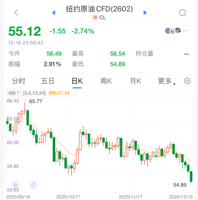 16日晚间,原油市场暴跌,WTI原油期货一度失守55美元/桶,为2021年2月以来首次,日内跌幅一度超过3%。在交易员将“供应即将过剩”的预期以及“乌克兰可能达成和平协议”的可能性计入价格后,油价今年的表现正朝着近七年来最差的方向发展。
