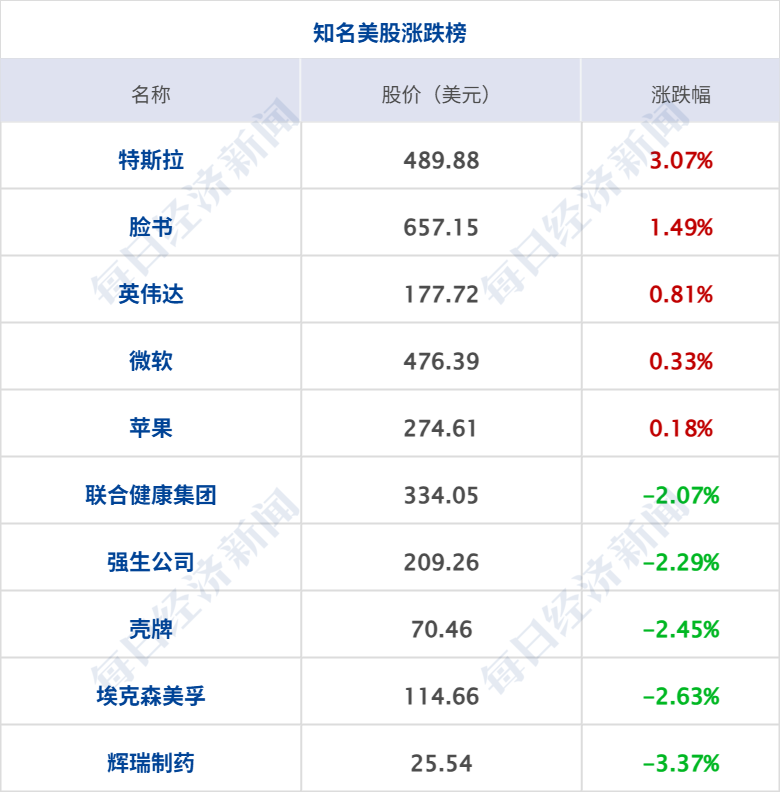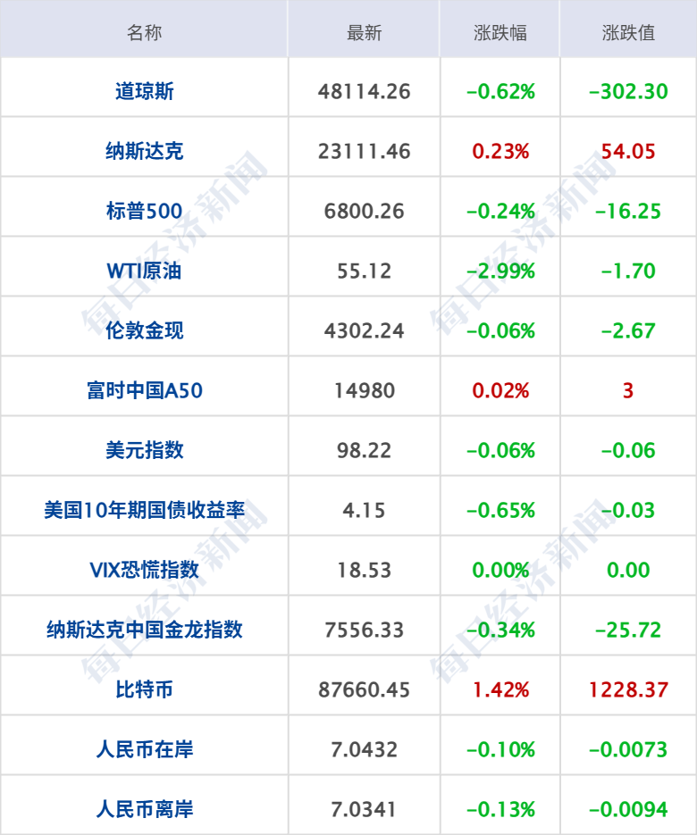 美股三大指数收盘涨跌不一,道指跌0.63%,纳指涨0.23%,标普500指数跌0.24%,特斯拉涨超3%创上市以来新高,Meta涨超1%;加密货币概念、计算机硬件板块涨幅居前,Hut 8涨近4%,Strategy、SanDisk涨超3%,昆腾涨近3%,戴尔科技涨超2%,西部数据、惠普涨超1%;油气、能源板块跌幅居前,英国石油跌超4%,壳牌、埃克森美孚、雪佛龙跌超2%。纳斯达克中国金龙指数跌0.34%,中概股涨跌不一,知乎涨超3%,金山云涨超2%,爱奇艺、网易、世纪互联、拼多多跌超1%。