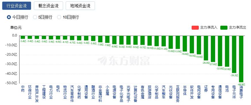 净流出方面,消费电子电子元件电池等净流出排名靠前,其中消费电子净流出48.90亿元。