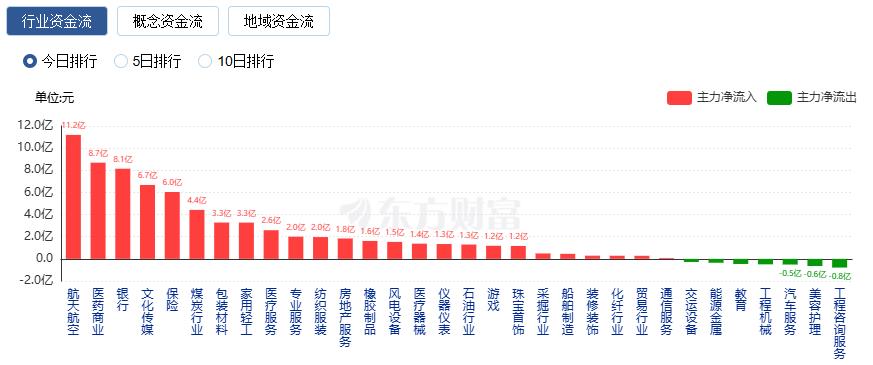 行业资金方面,截至收盘,航天航空医药商业银行等净流入排名靠前,其中航天航空净流入11.20亿。