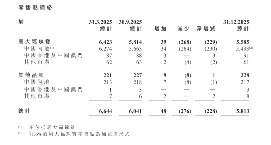报告披露,周大福珠宝加盟店于季内对中国内地零售值的贡献为66.2%,2025财政年度三季度的数值则为69.7%。