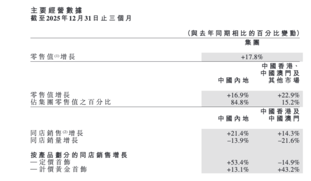 同店销售是指来自2024年4月1日前开业并于2025年12月31日仍然存续的周大福珠宝直营零售点的零售值,不包括加盟零售点及其他渠道的零售值。